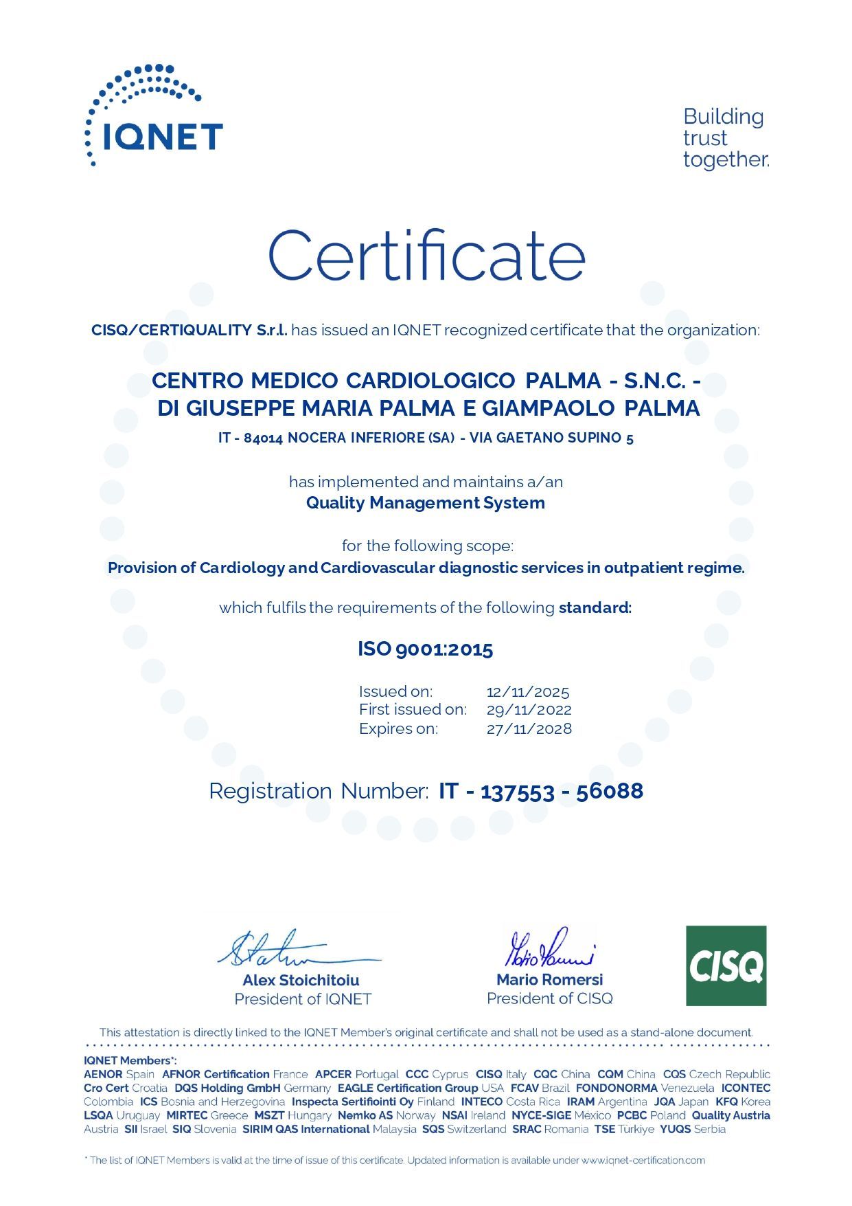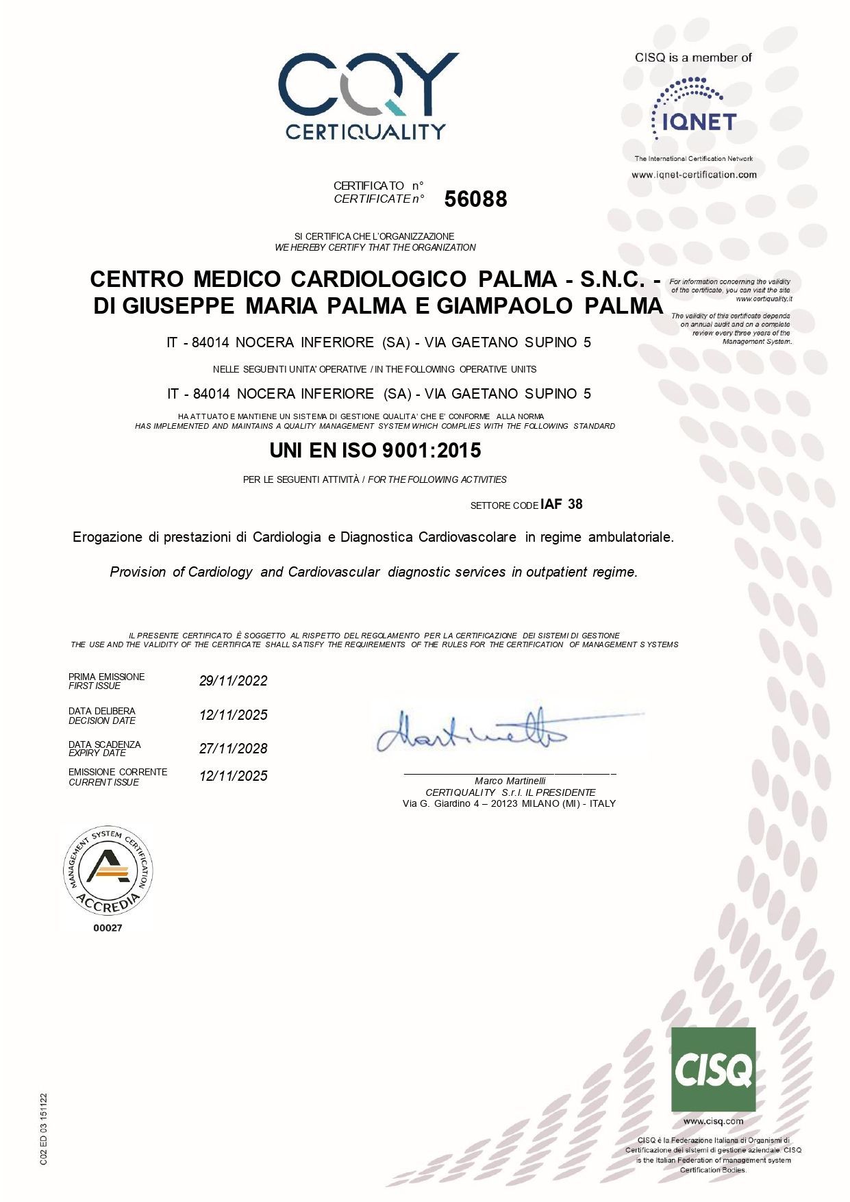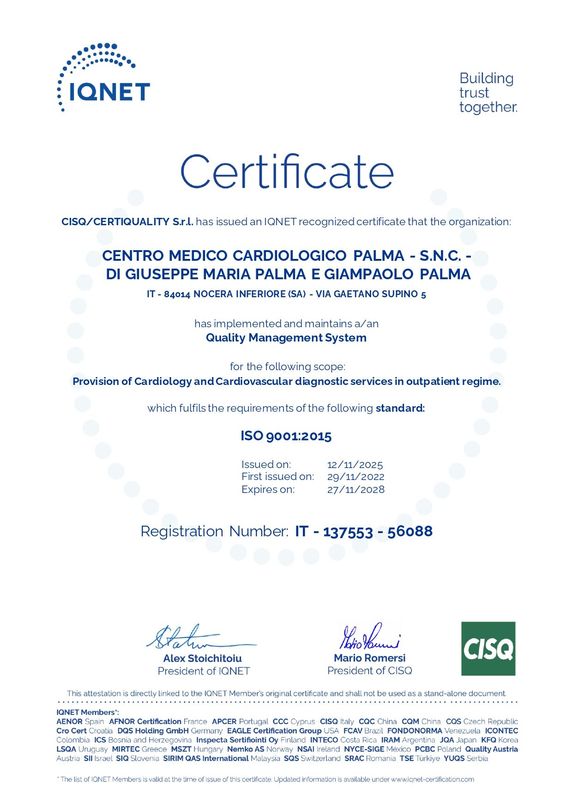 Siamo lieti di comunicare ai nostri pazienti che anche quest'anno, grazie all'impegno, alla dedizione, alla perseveranza, al sacrificio, e al contributo di qualità di tutta la nostra organizzazione, del personale medico e paramedico, abbiamo superato la verifica per il mantenimento della certificazione di qualità UN ISO 9001: 2015 dell'Ente di Certificazione con rilevanza Nazionale Certiquality. Continueremo ad operare con tutte le nostre energie per conservare, e se possibile migliorare giorno per giorno, il servizio salute ai nostri pazienti che sono e restano la ragion d'essere della nostra esistenza . Un grazie di cuore a tutti i nostri collaboratori per il contributo di qualità e di eccellenza e per il mantenimento dello standard di qualità di eccellenza certificato da Ente di rilevanza nazionale.